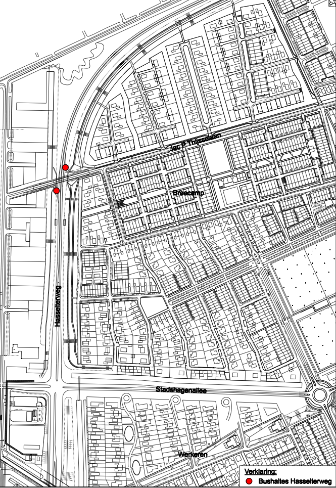 “Het college zal niet gaan investeren in genoemde tijdelijke haltes. De nieuwe Hasselterweg wordt naar verwachting in het voorjaar van 2014 opgeleverd en in gebruik genomen. Dan kan ook de nieuwe halte bij Breecamp-Oost ter hoogte van de nog te bouwen fietstunnel in het verlengde van de Jac P. Thijsselaan in gebruik worden genomen (zie onderstaande kaart), waardoor de bereikbaarheid van dit gebied wordt vergroot. Tot die tijd zullen reizigers gebruik moeten maken van het bestaande openbaar vervoersnetwerk in en om Stadshagen.”