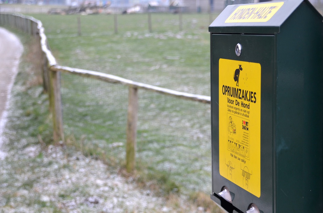 Een afvalbak voor honden met zakjes bij de kinderboerderij, achter basisschool De Vlieger
