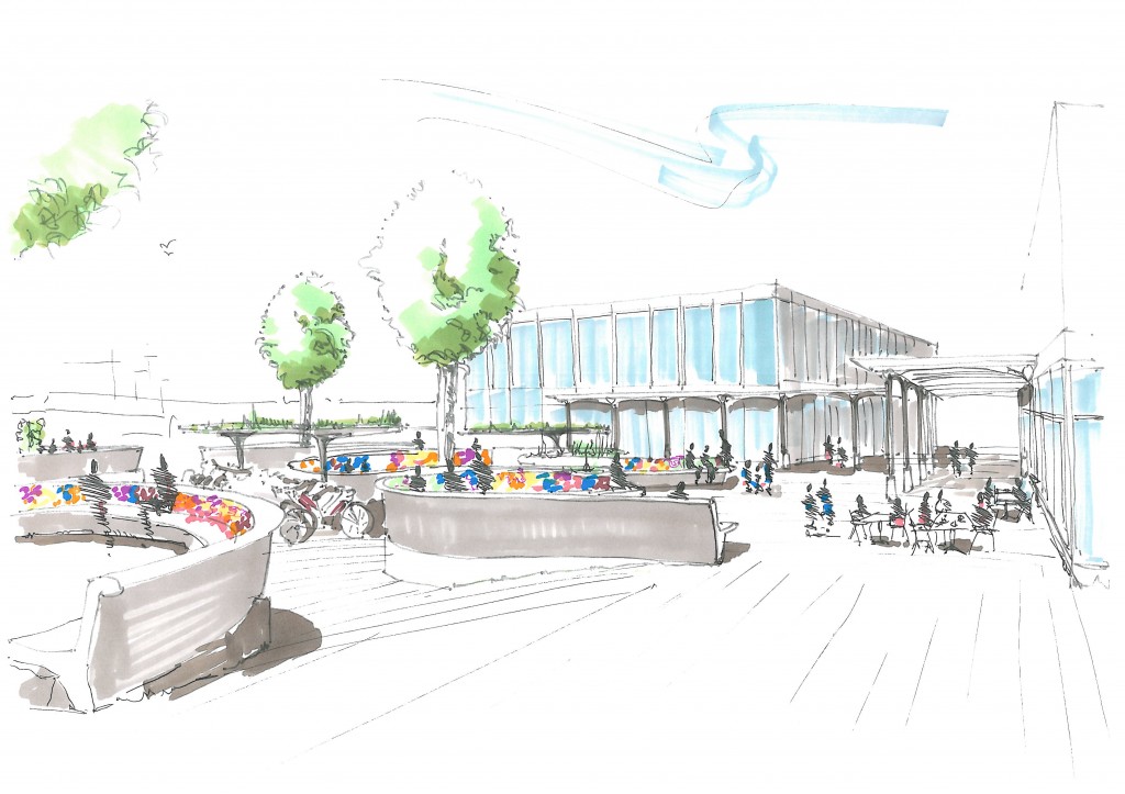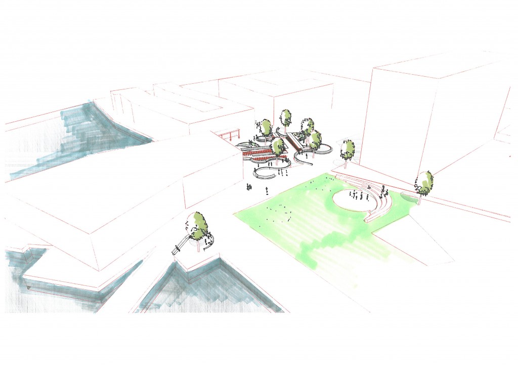 Die voorzieningen zijn nuttig, maar mogen er in onze ogen niet toe leiden dat het plein verder verrommelt. Hooft graafland heeft dat opgelost met een ontwerp van een half verdiepte fietsenstalling, met een dak van sedum en struiken, met rondom meanderende bankjes die de