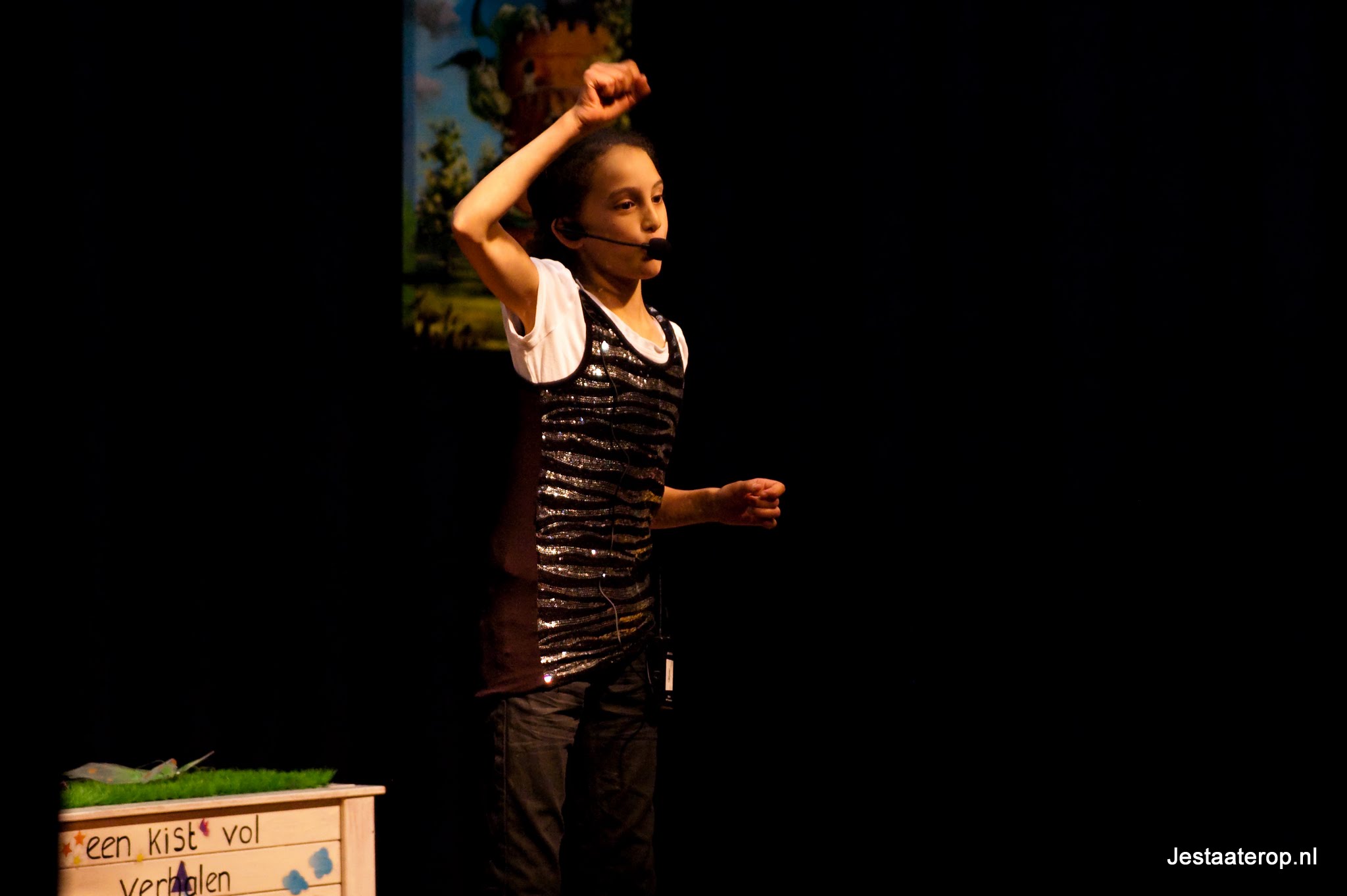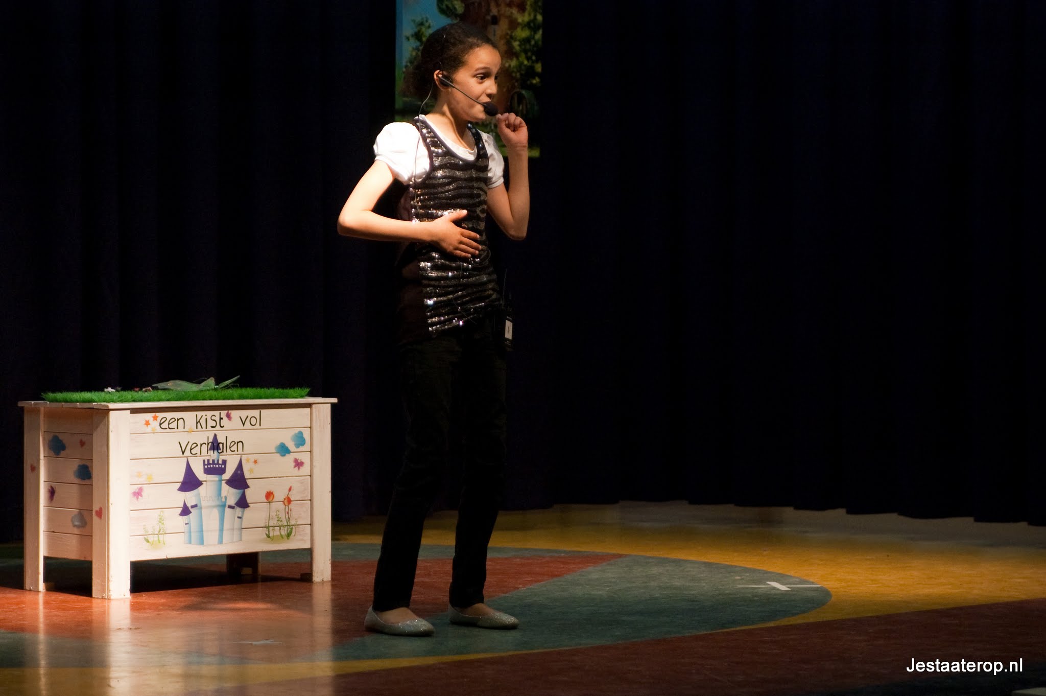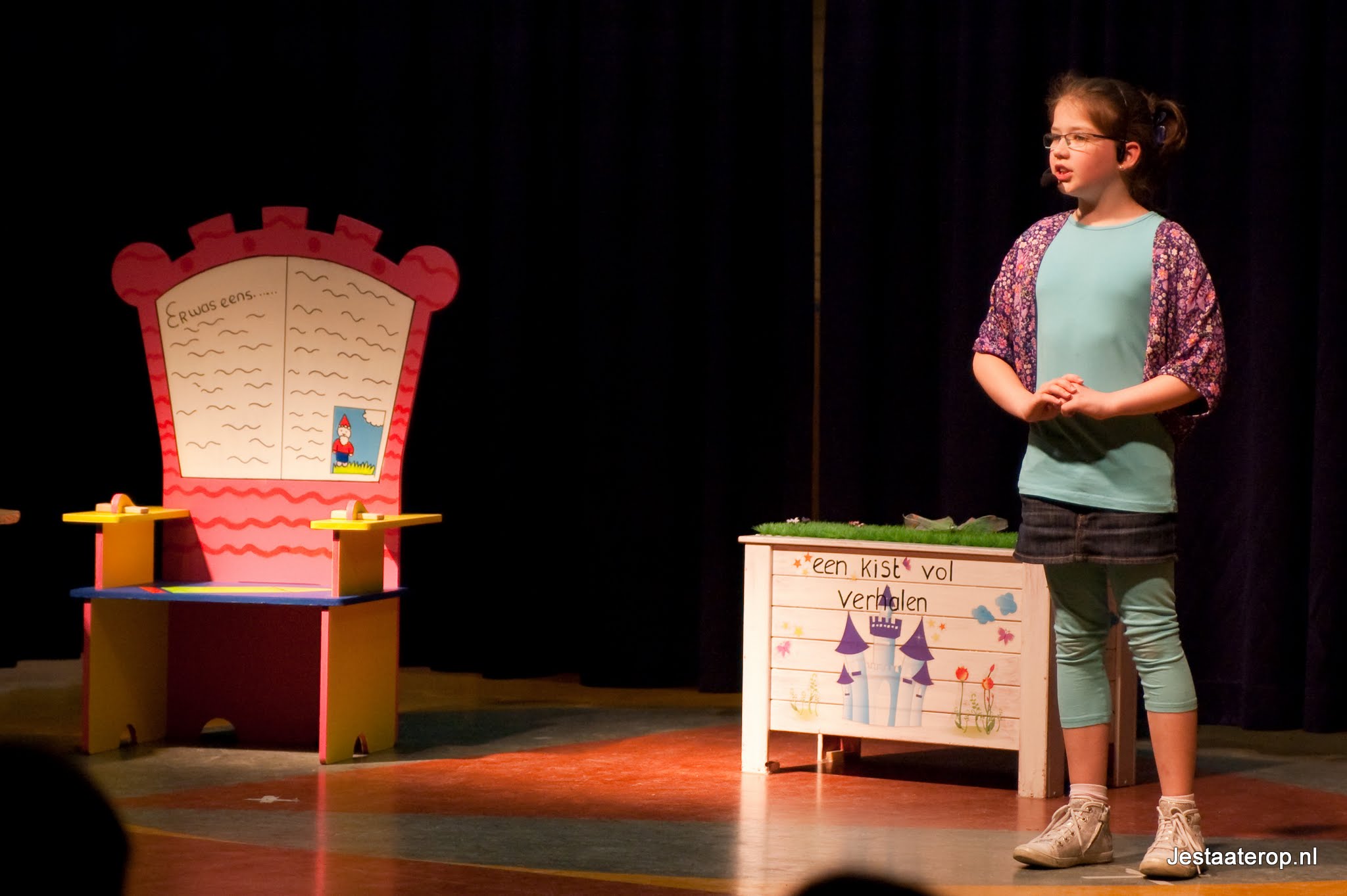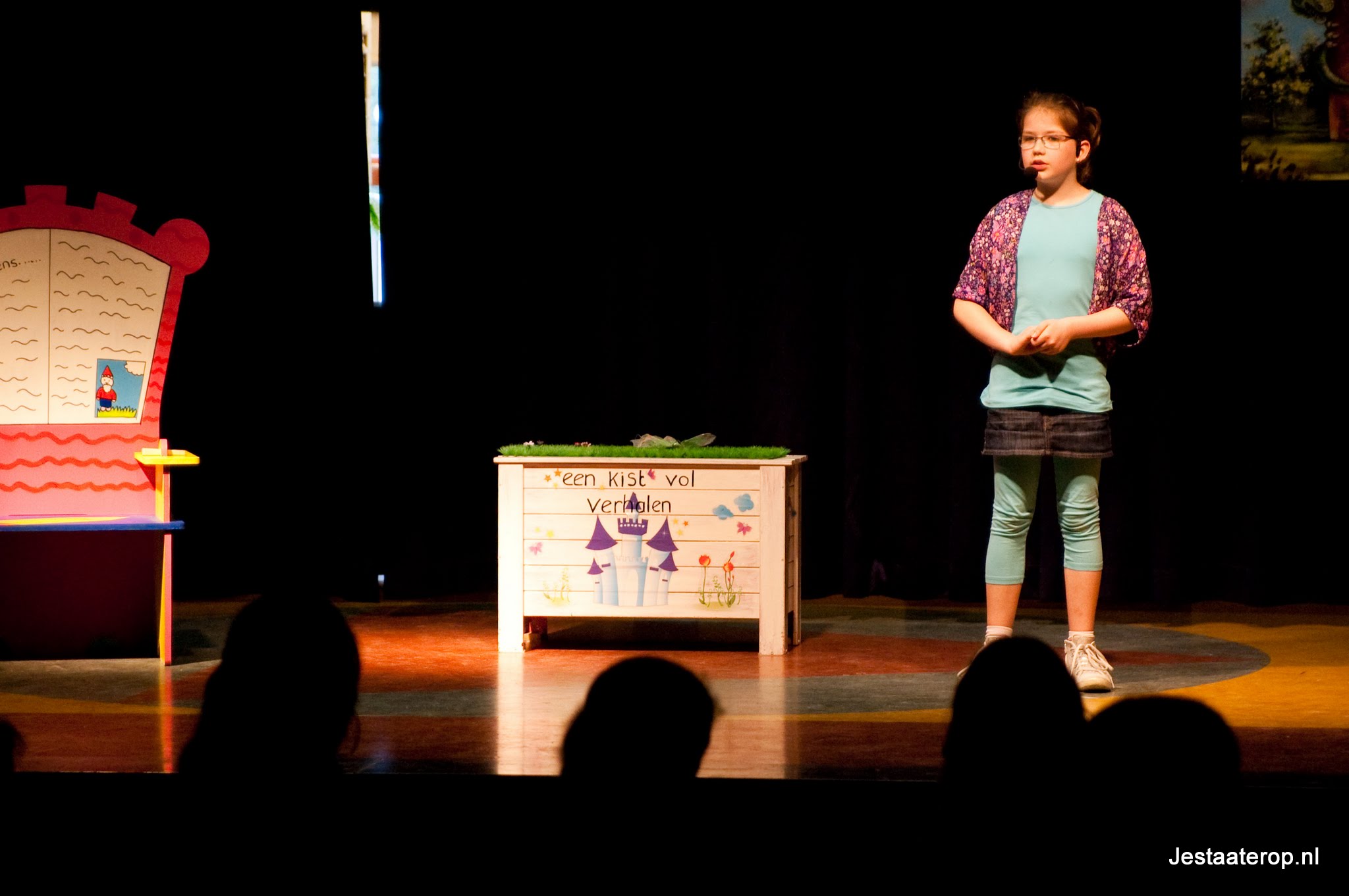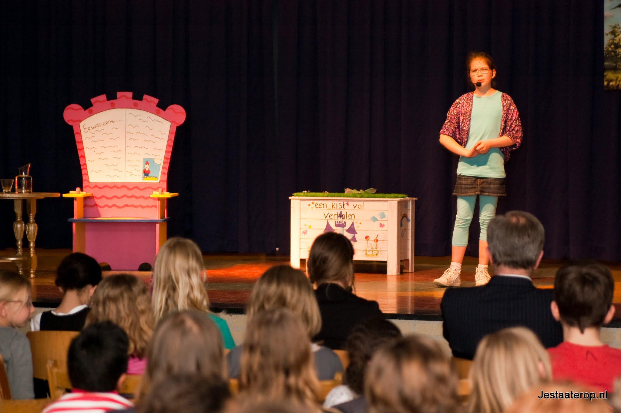 Zeven vertellers uit de groepen 6, 7 en 8 hebben voor een volle zaal hun verhaal mogen vertellen. Alle zeven meisjes hadden een sprookje van Grimm uitgezocht. Niet toevallig, omdat Zwolle in 2012 Grimm-stad is. Gwenda, Yousra, Anush, Emma, Bo, Juliette en Sascha hebben vol enthousiasme voor een ademloos publiek verteld over Hans en Grietje, Assepoester, Repelsteeltje, De Drie Talen, Vrouw Holle en De Wolf en de Zeven Geitjes.