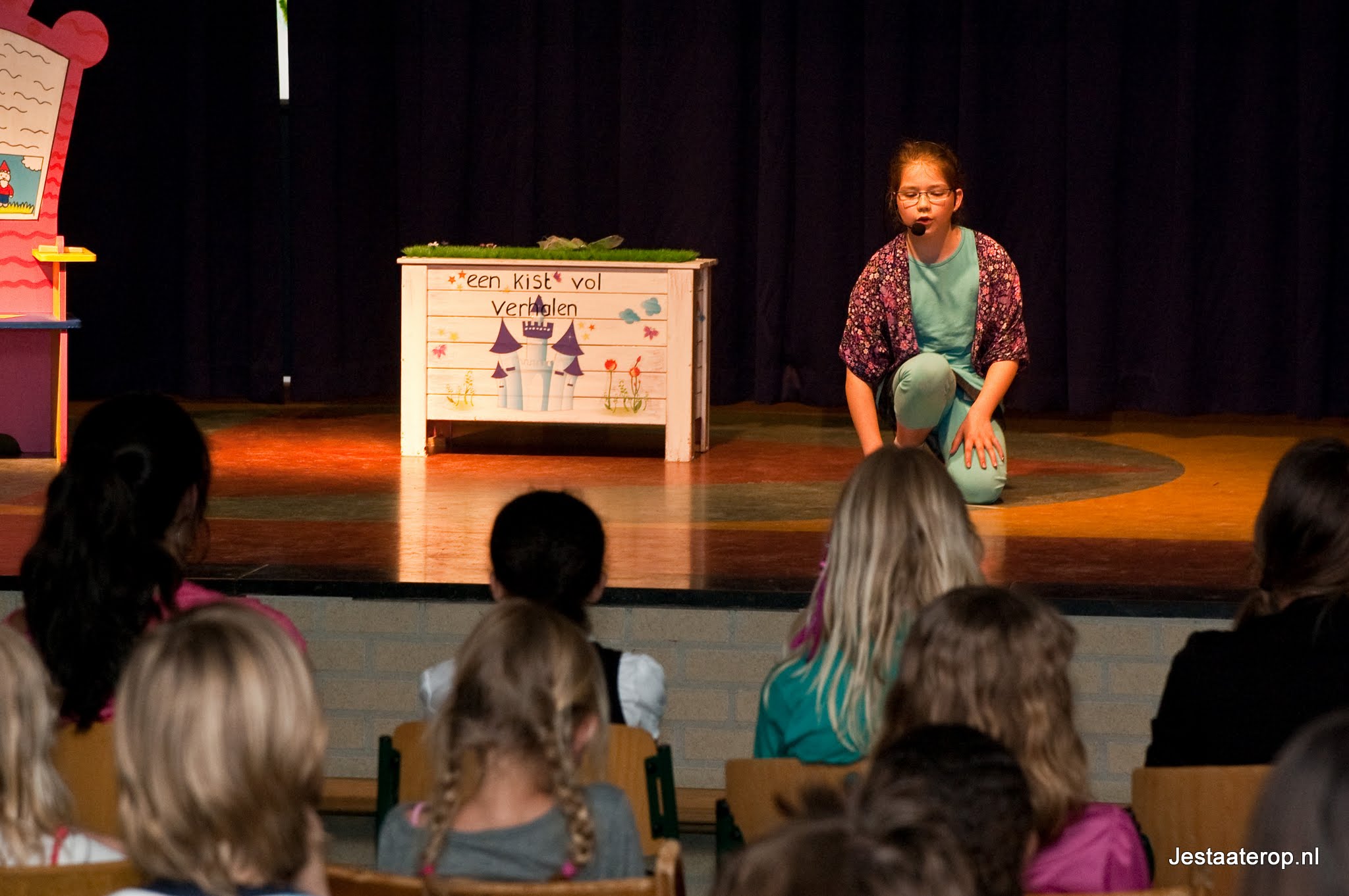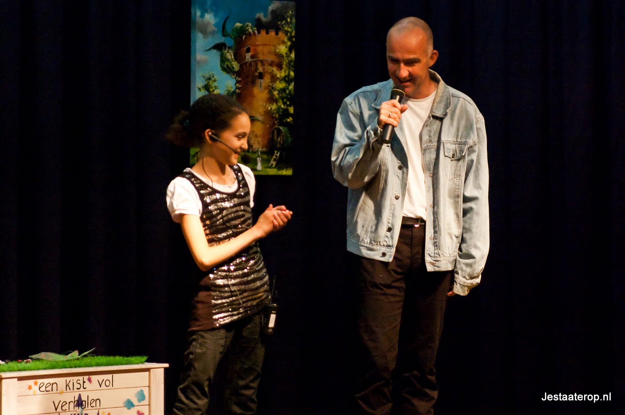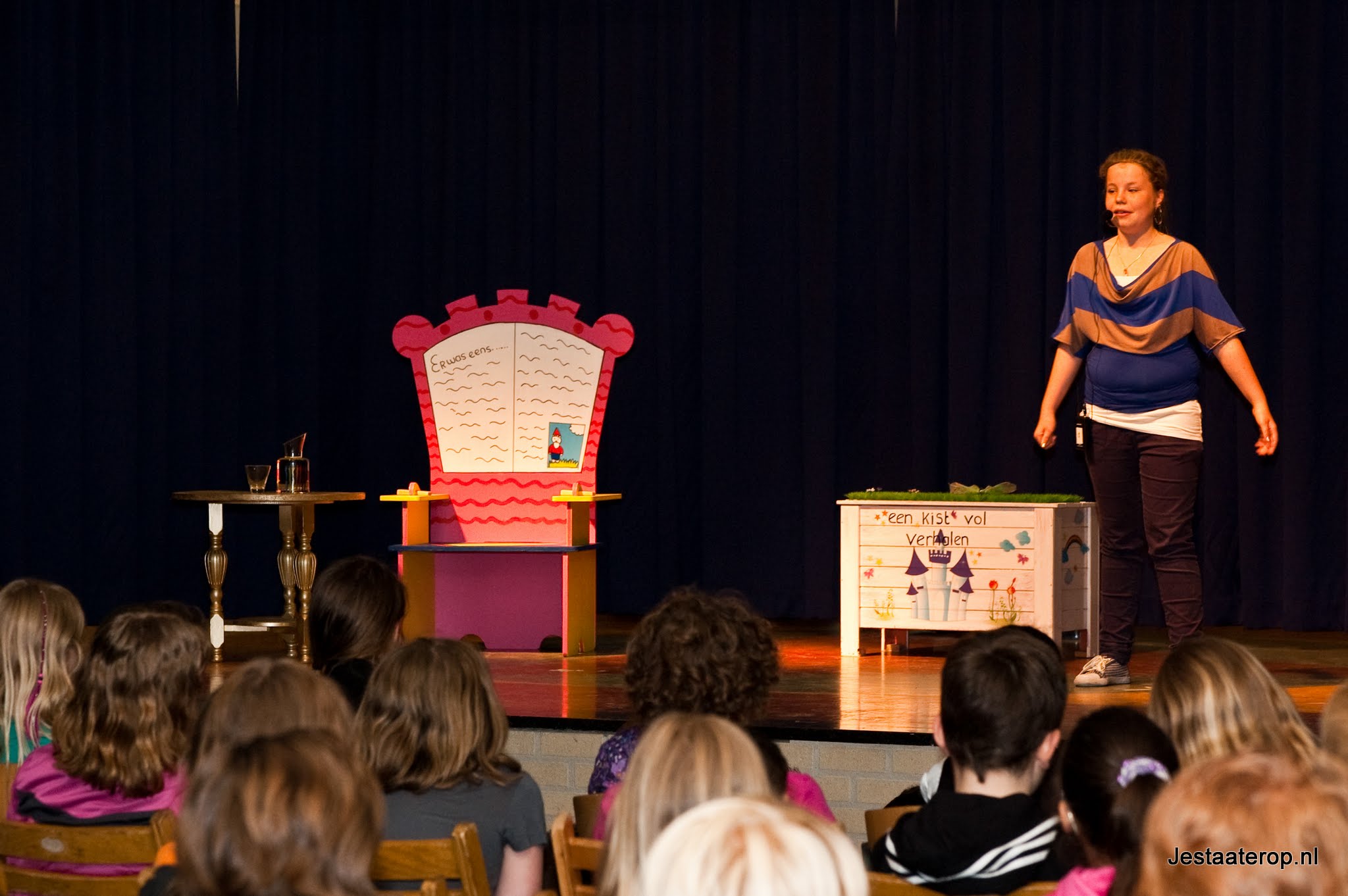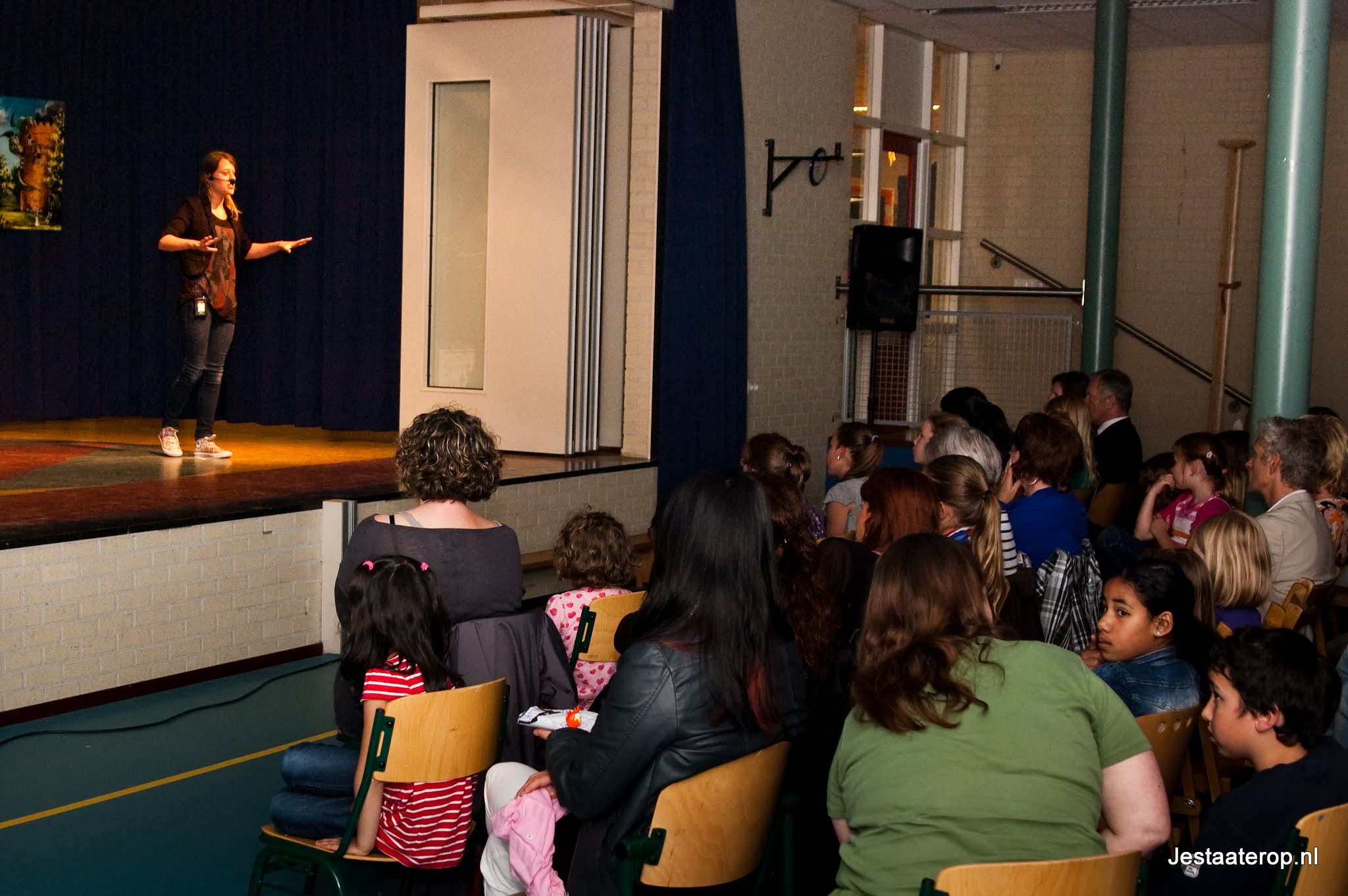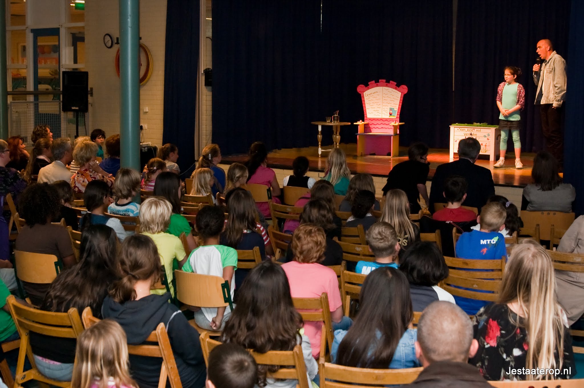 Zeven vertellers uit de groepen 6, 7 en 8 hebben voor een volle zaal hun verhaal mogen vertellen. Alle zeven meisjes hadden een sprookje van Grimm uitgezocht. Niet toevallig, omdat Zwolle in 2012 Grimm-stad is. Gwenda, Yousra, Anush, Emma, Bo, Juliette en Sascha hebben vol enthousiasme voor een ademloos publiek verteld over Hans en Grietje, Assepoester, Repelsteeltje, De Drie Talen, Vrouw Holle en De Wolf en de Zeven Geitjes.