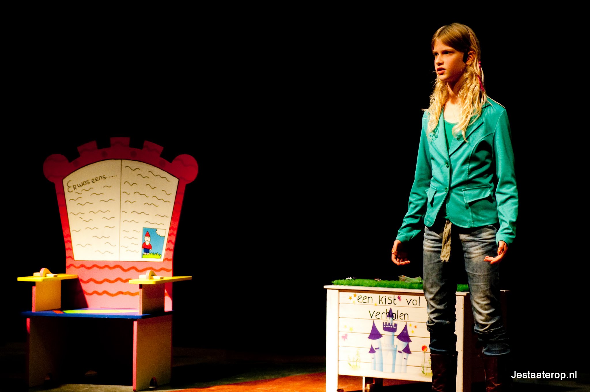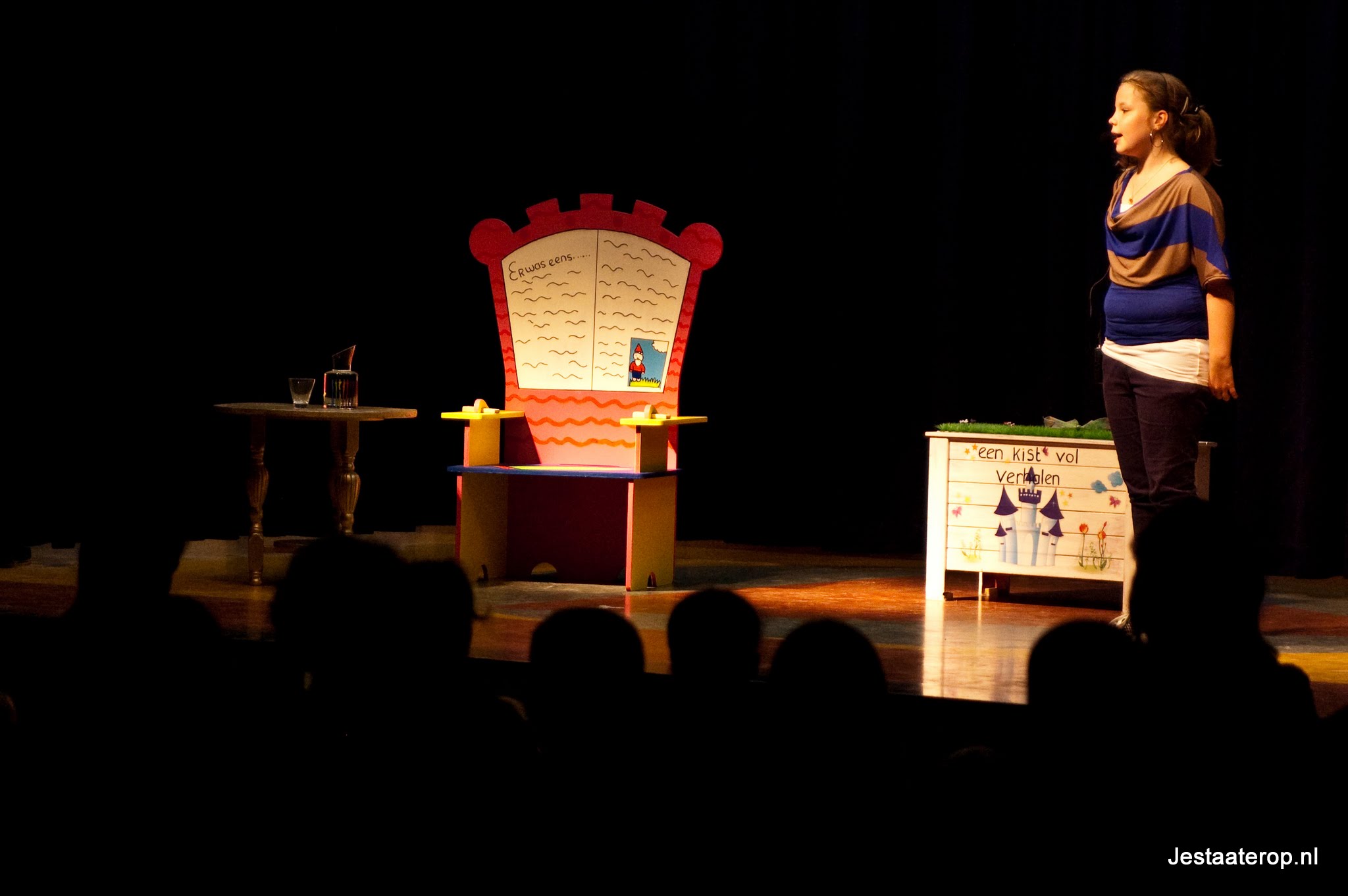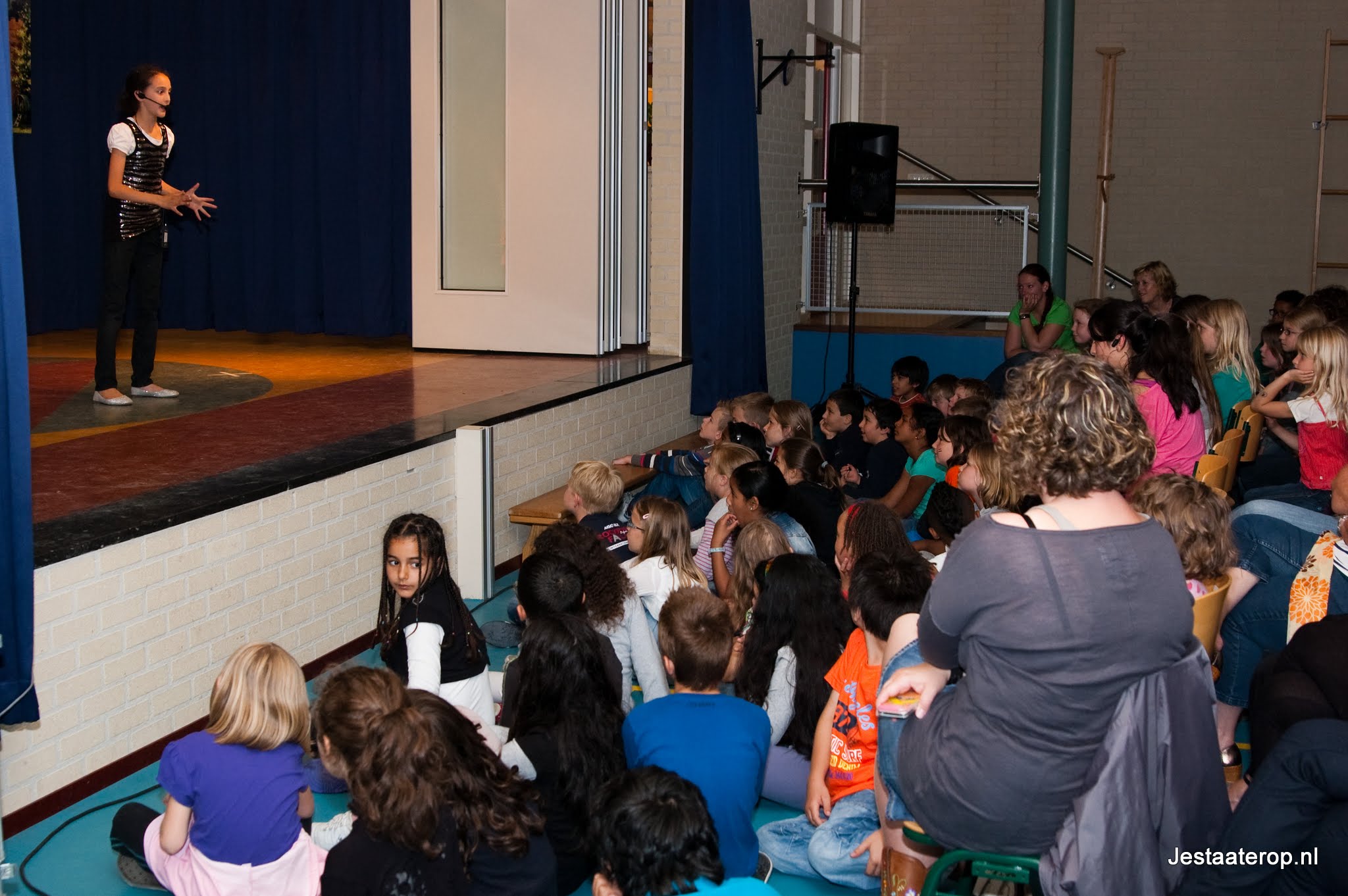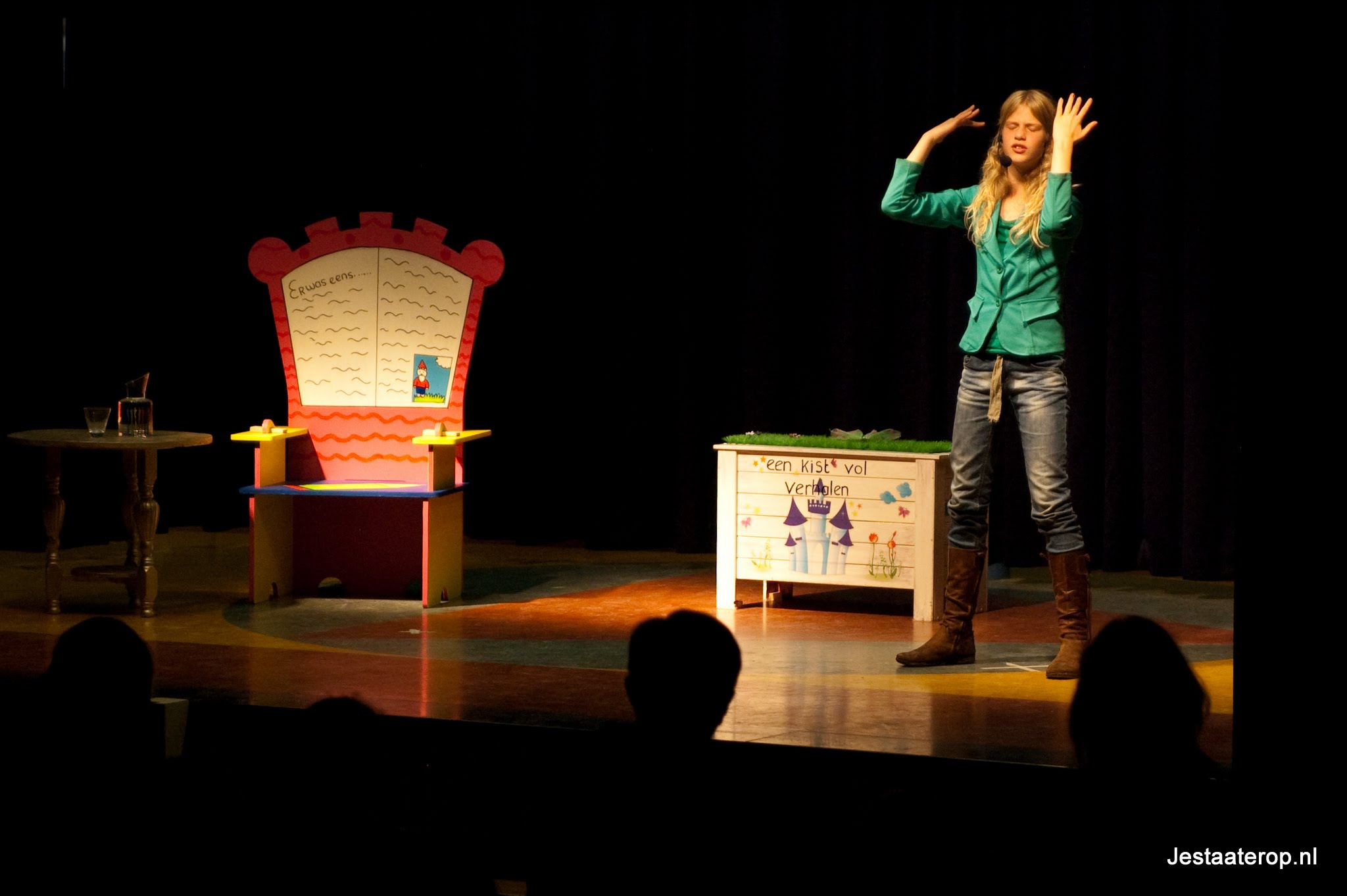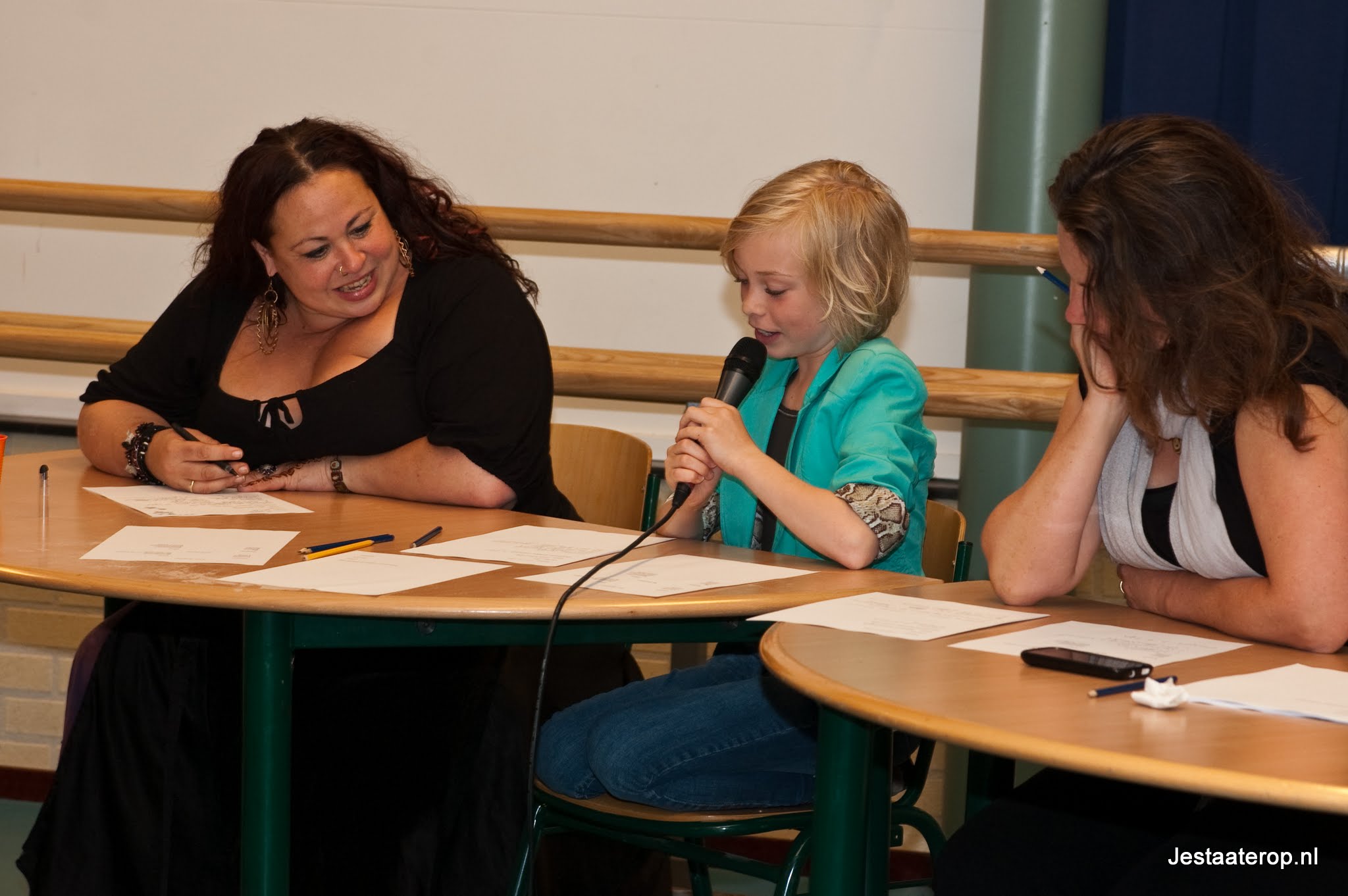 Zeven vertellers uit de groepen 6, 7 en 8 hebben voor een volle zaal hun verhaal mogen vertellen. Alle zeven meisjes hadden een sprookje van Grimm uitgezocht. Niet toevallig, omdat Zwolle in 2012 Grimm-stad is. Gwenda, Yousra, Anush, Emma, Bo, Juliette en Sascha hebben vol enthousiasme voor een ademloos publiek verteld over Hans en Grietje, Assepoester, Repelsteeltje, De Drie Talen, Vrouw Holle en De Wolf en de Zeven Geitjes.