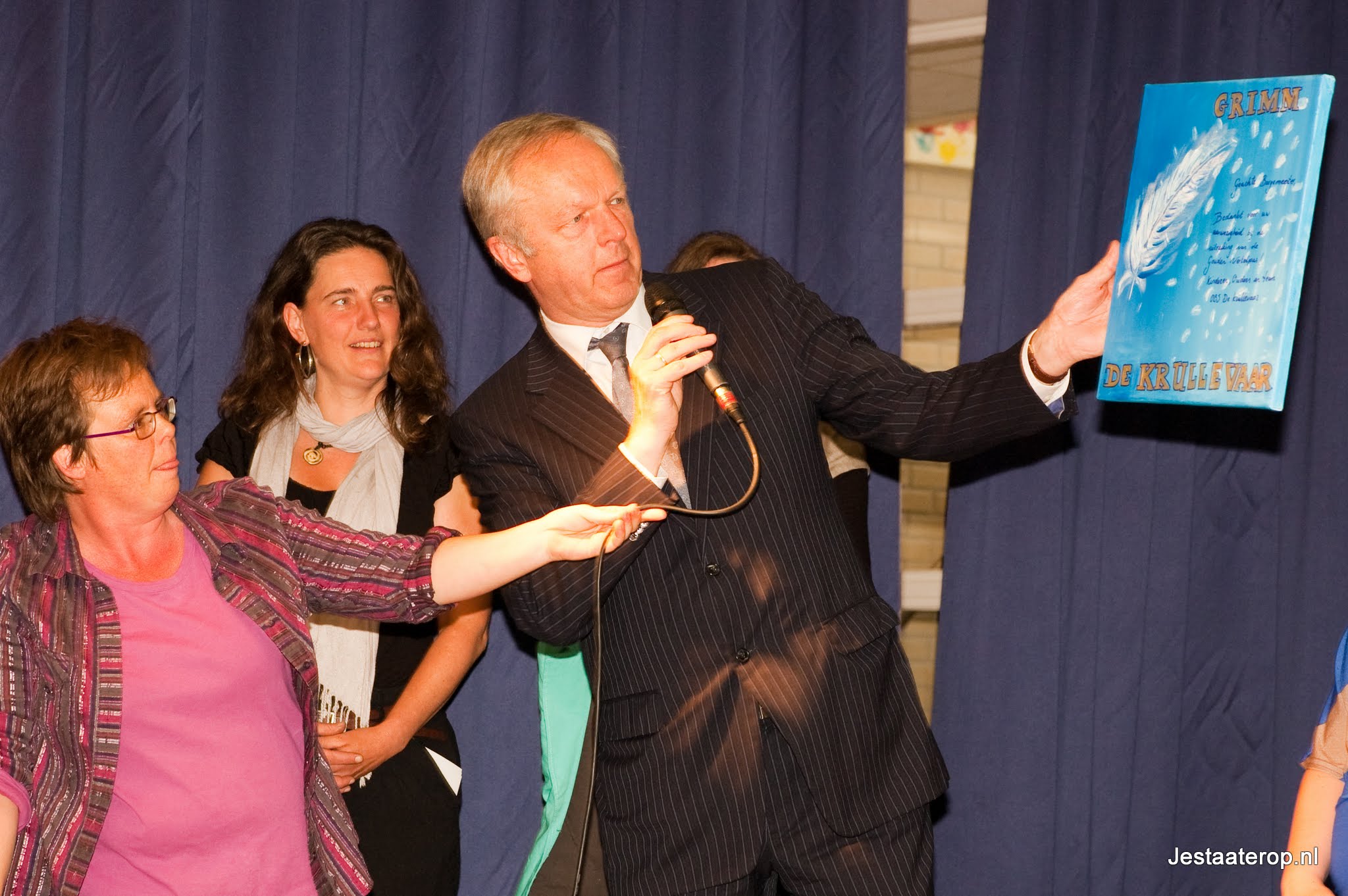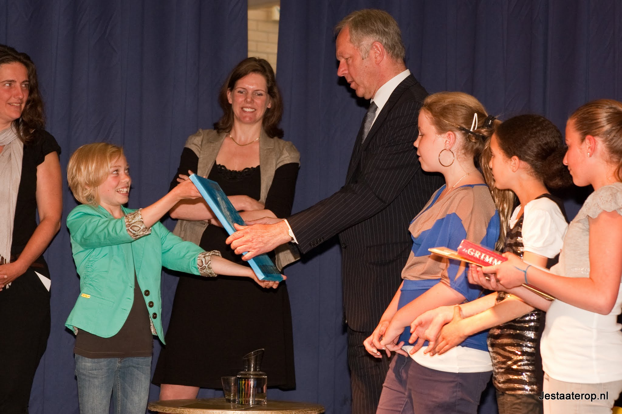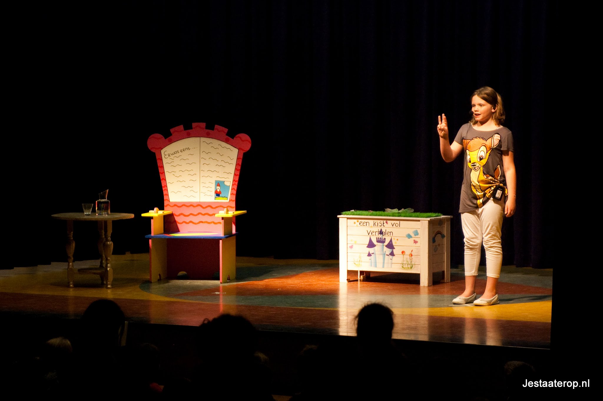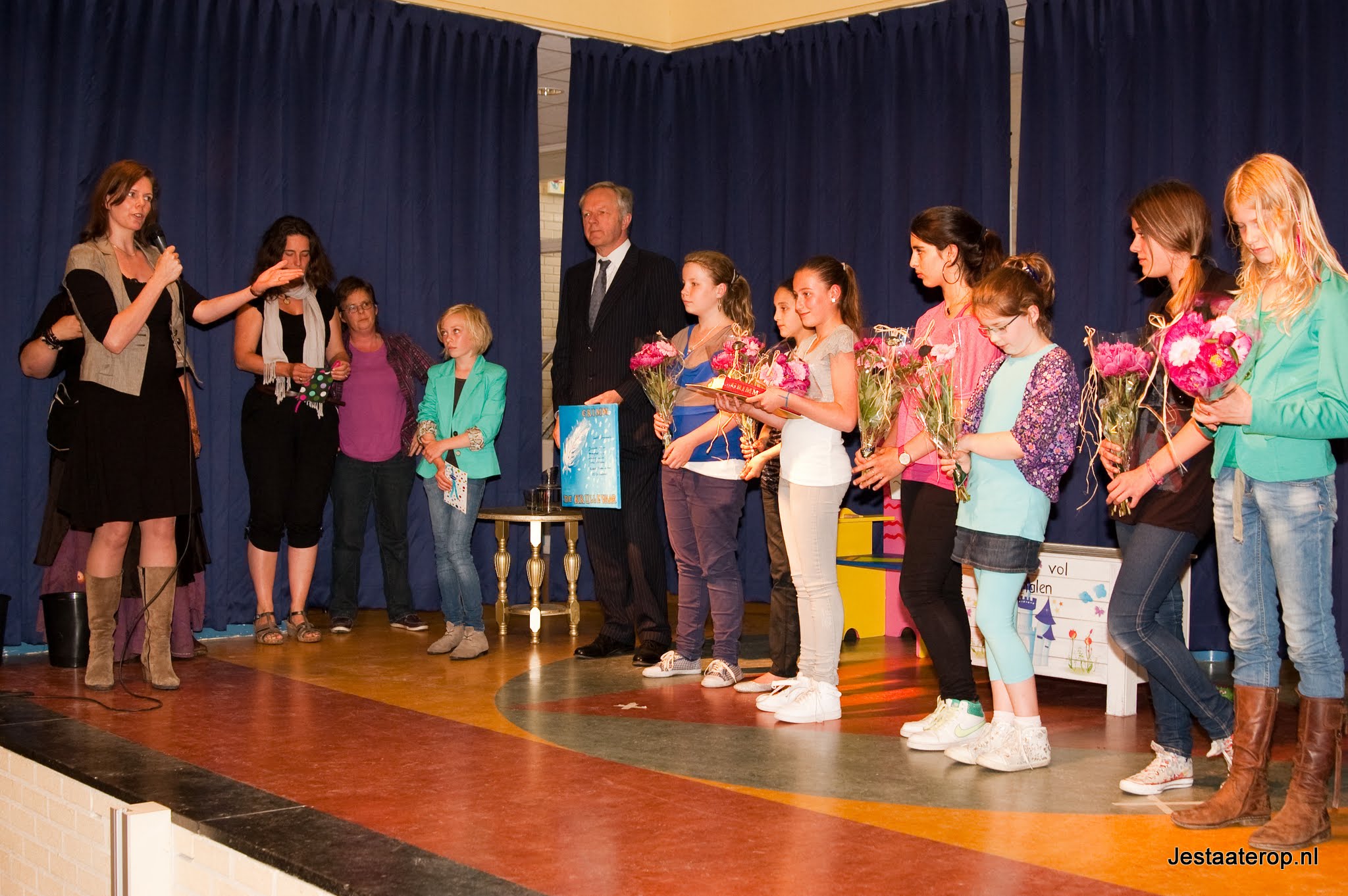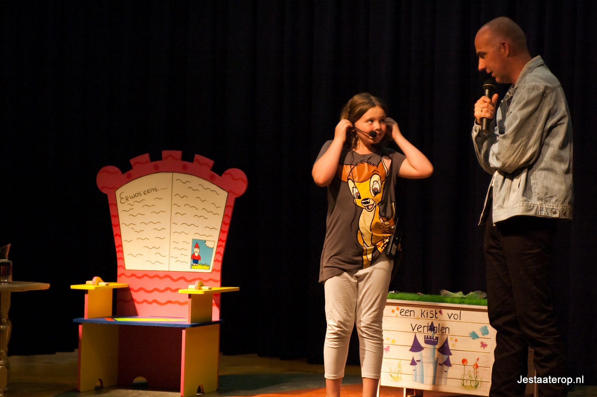Zeven vertellers uit de groepen 6, 7 en 8 hebben voor een volle zaal hun verhaal mogen vertellen. Alle zeven meisjes hadden een sprookje van Grimm uitgezocht. Niet toevallig, omdat Zwolle in 2012 Grimm-stad is. Gwenda, Yousra, Anush, Emma, Bo, Juliette en Sascha hebben vol enthousiasme voor een ademloos publiek verteld over Hans en Grietje, Assepoester, Repelsteeltje, De Drie Talen, Vrouw Holle en De Wolf en de Zeven Geitjes.