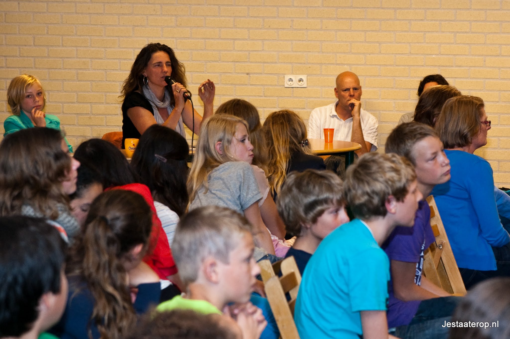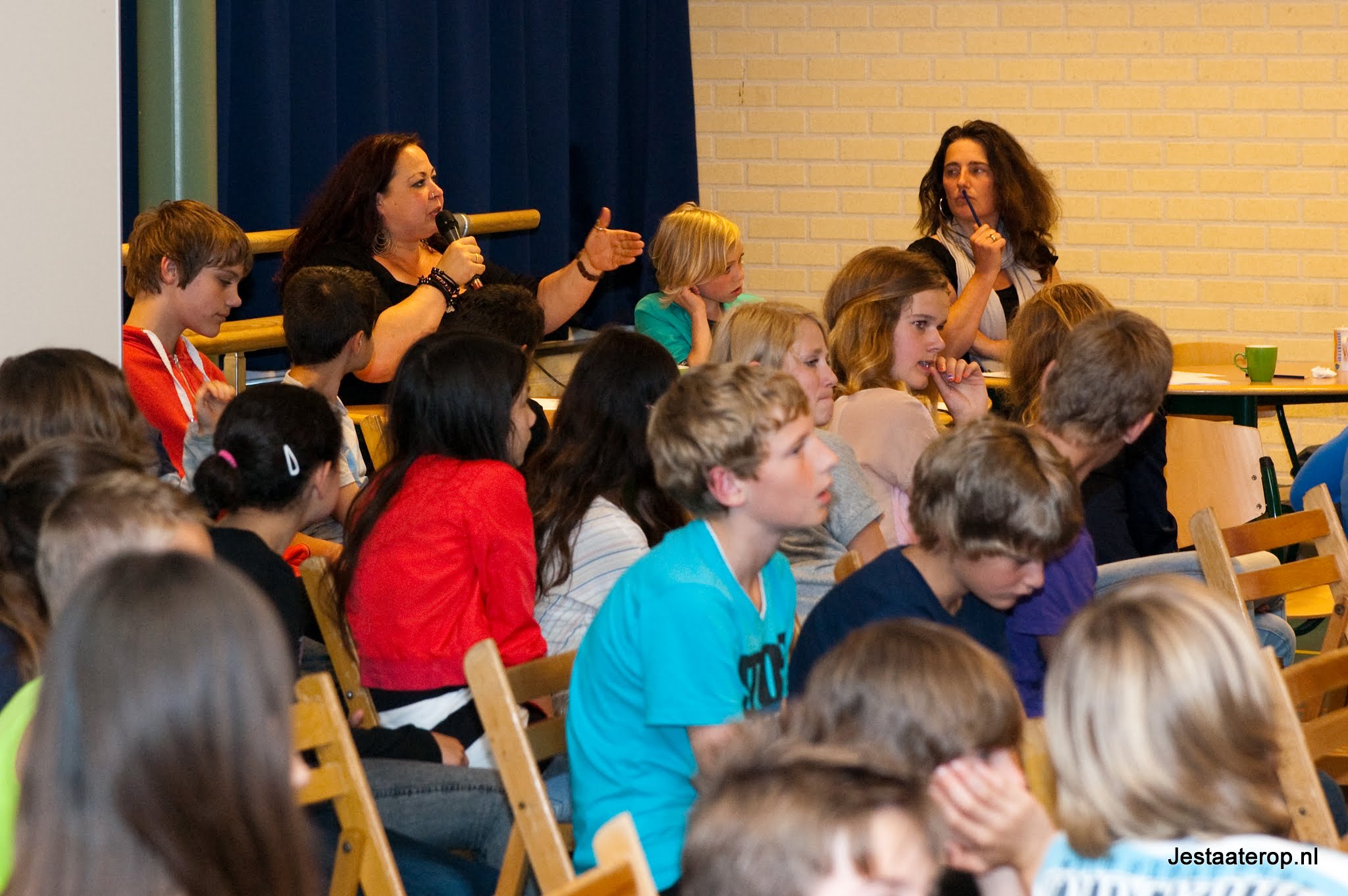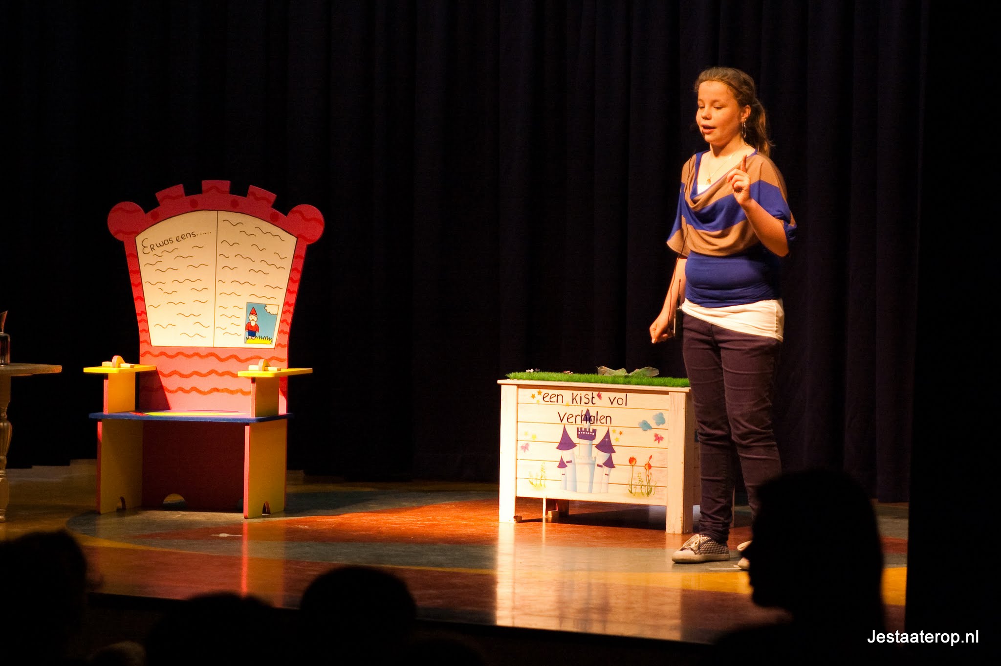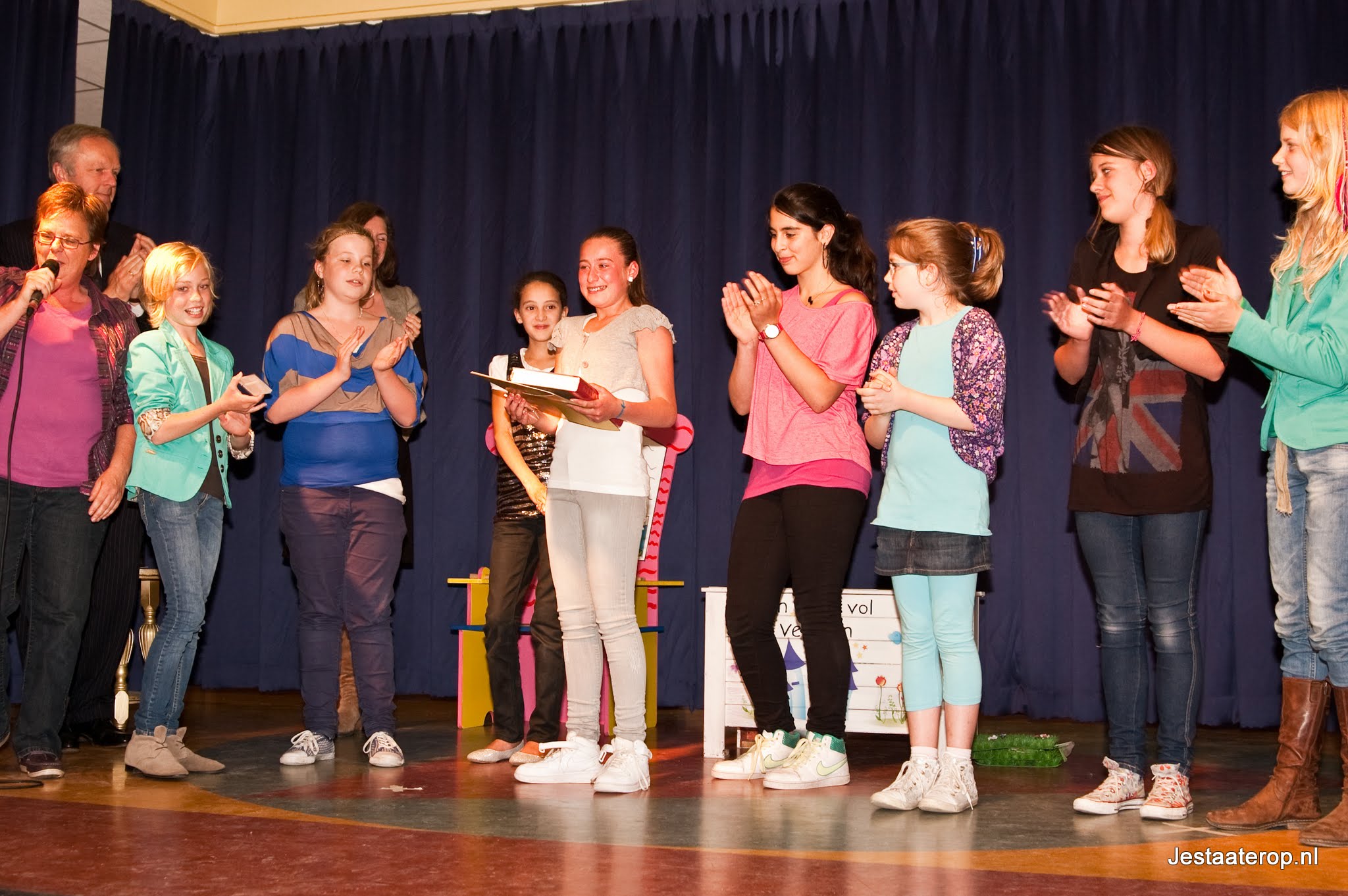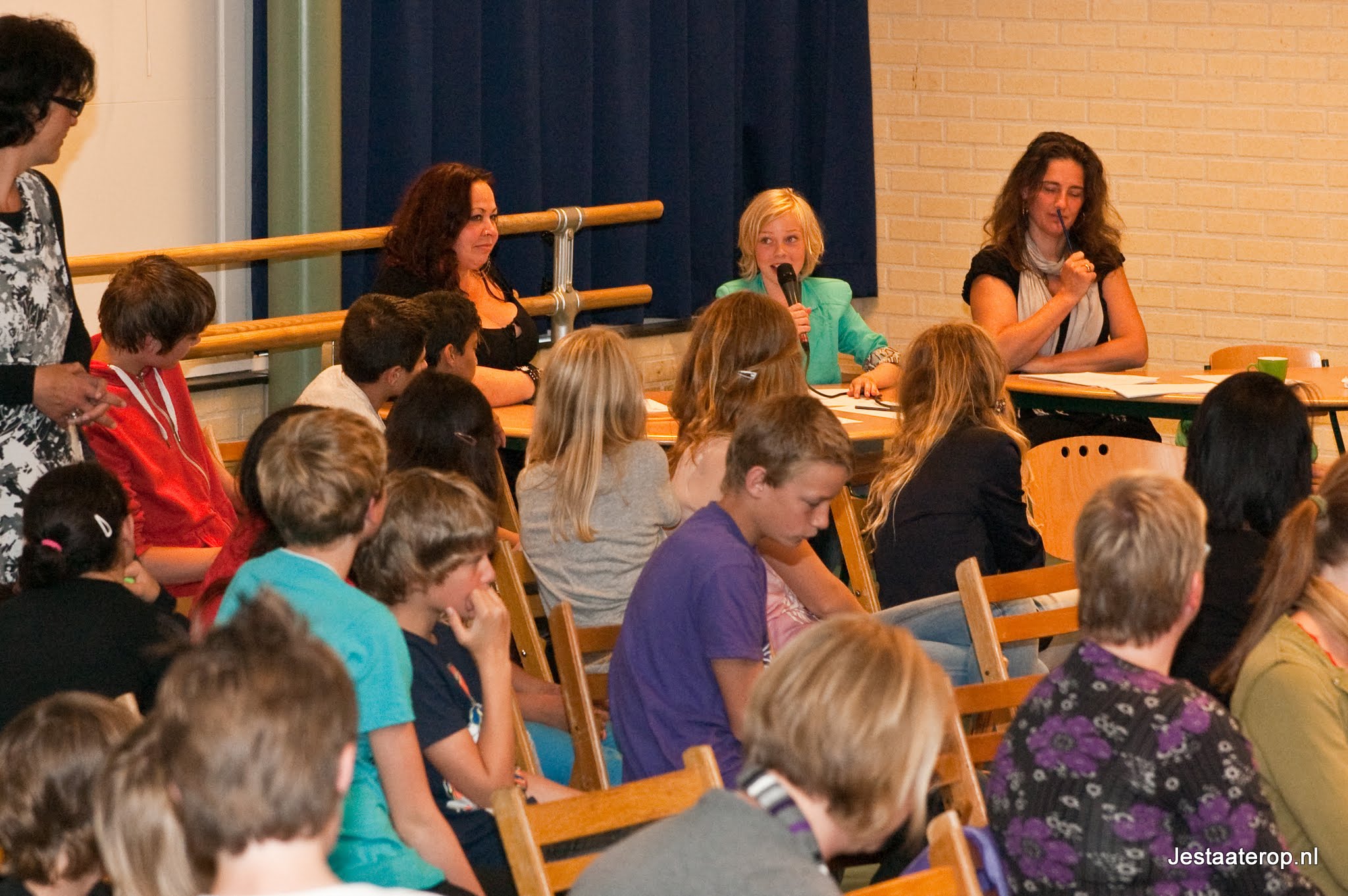 Zeven vertellers uit de groepen 6, 7 en 8 hebben voor een volle zaal hun verhaal mogen vertellen. Alle zeven meisjes hadden een sprookje van Grimm uitgezocht. Niet toevallig, omdat Zwolle in 2012 Grimm-stad is. Gwenda, Yousra, Anush, Emma, Bo, Juliette en Sascha hebben vol enthousiasme voor een ademloos publiek verteld over Hans en Grietje, Assepoester, Repelsteeltje, De Drie Talen, Vrouw Holle en De Wolf en de Zeven Geitjes.
