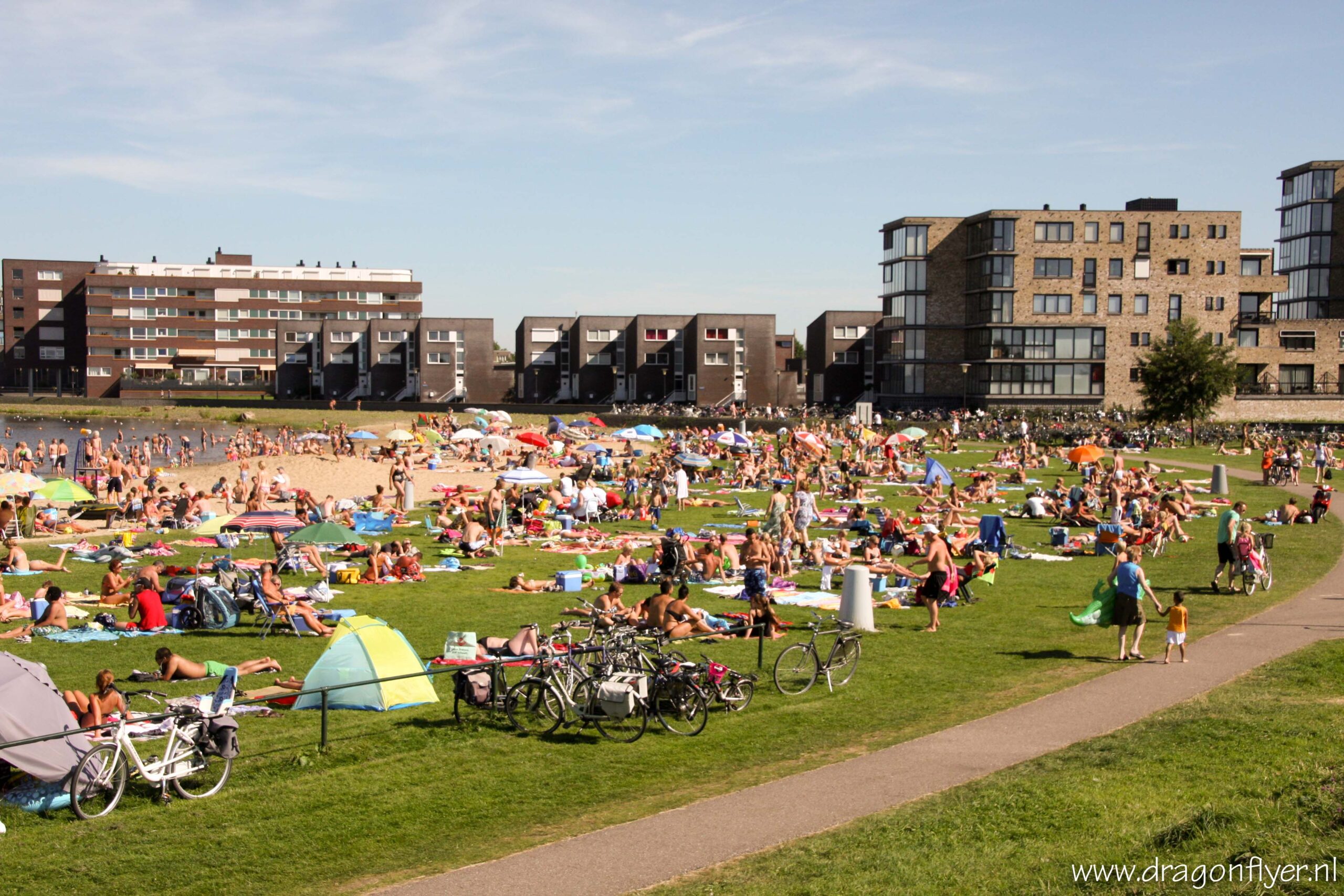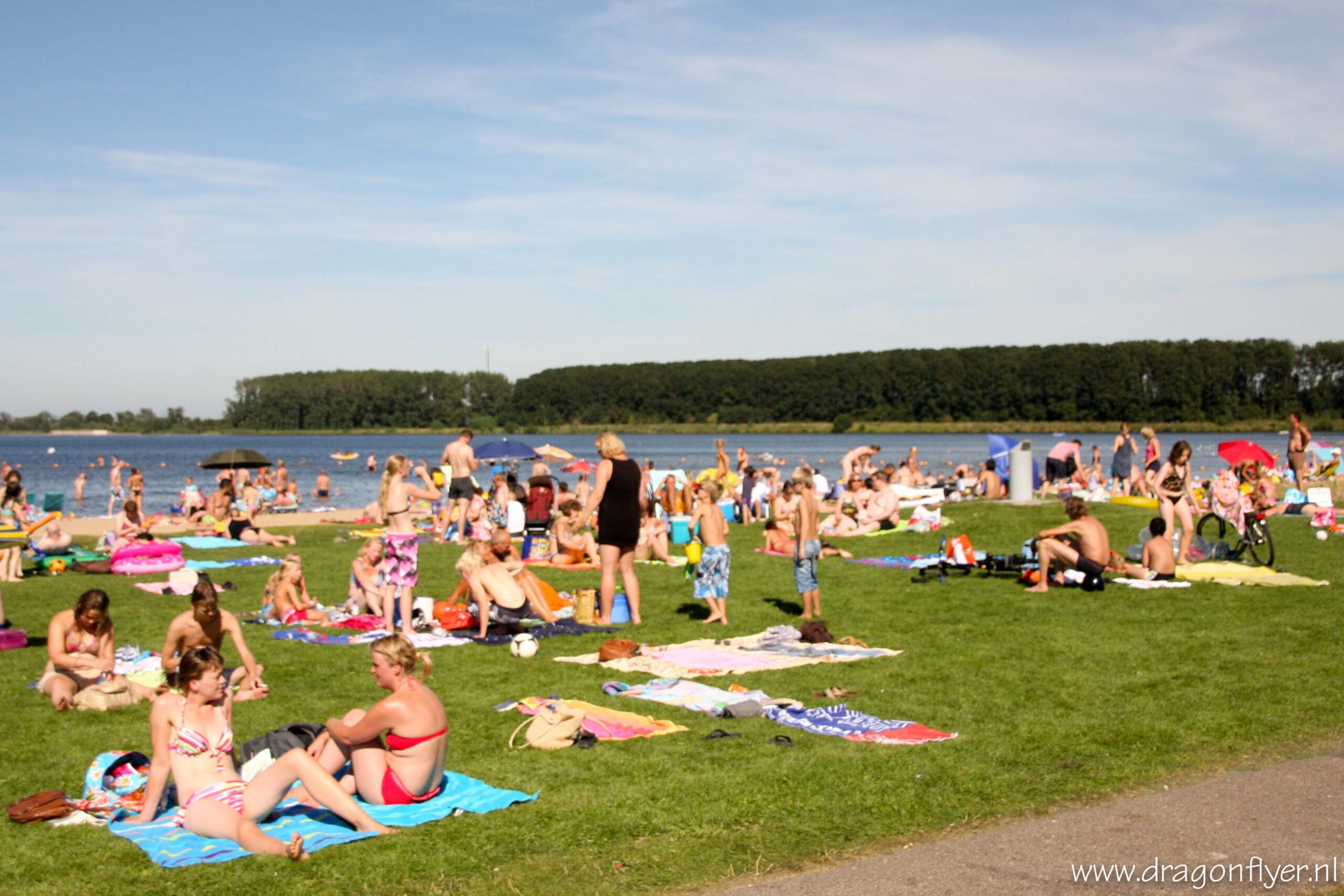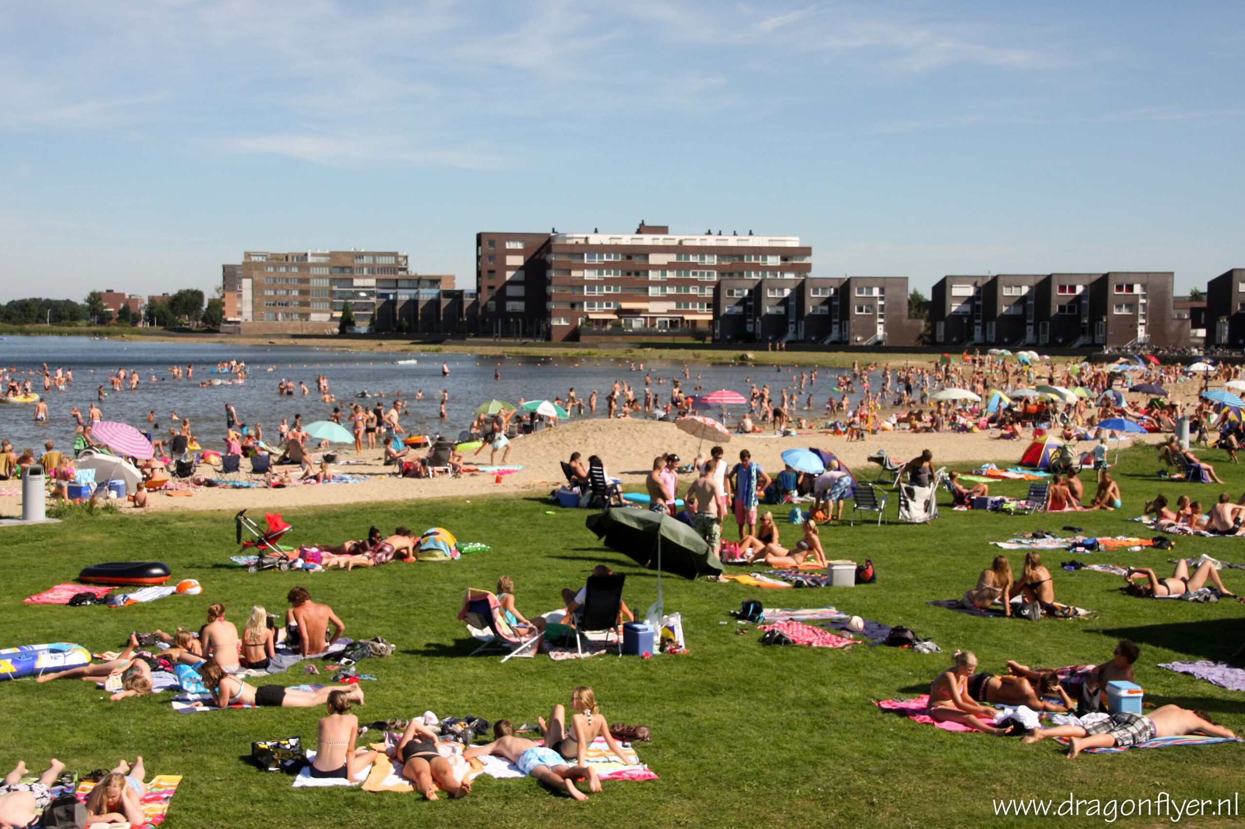 Warm, zeg maar gerust heet. Zaterdag 18 augustus is genoteerd als de eerste tropische dag van het 2012. In De Bilt passerde het kwik rond kwart voor drie de 30 graden Celsius. Ook hier in ons Stadshagen vielen de mussen hier en daar letterlijk van het dak.Vele mensen zochten verkoeling bij de Milligerplas. Het strand zat dan ook overvol met zonaanbidders en spelende kinderen. Voor sommigen was het nog niet warm genoeg, zij hadden nog energie over voor een fanatiek potje volleybal, en dit allemaal onder de brandende zon.