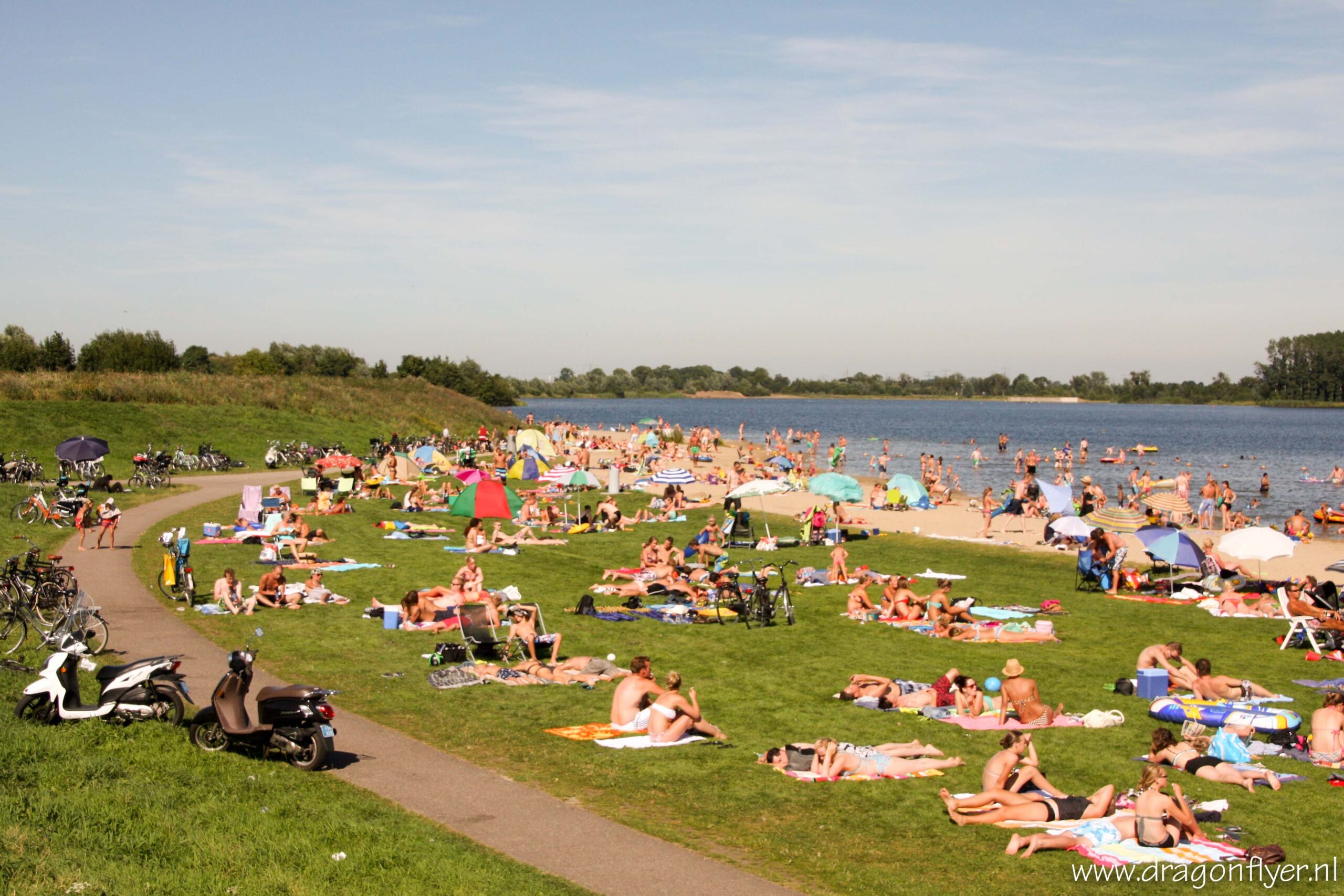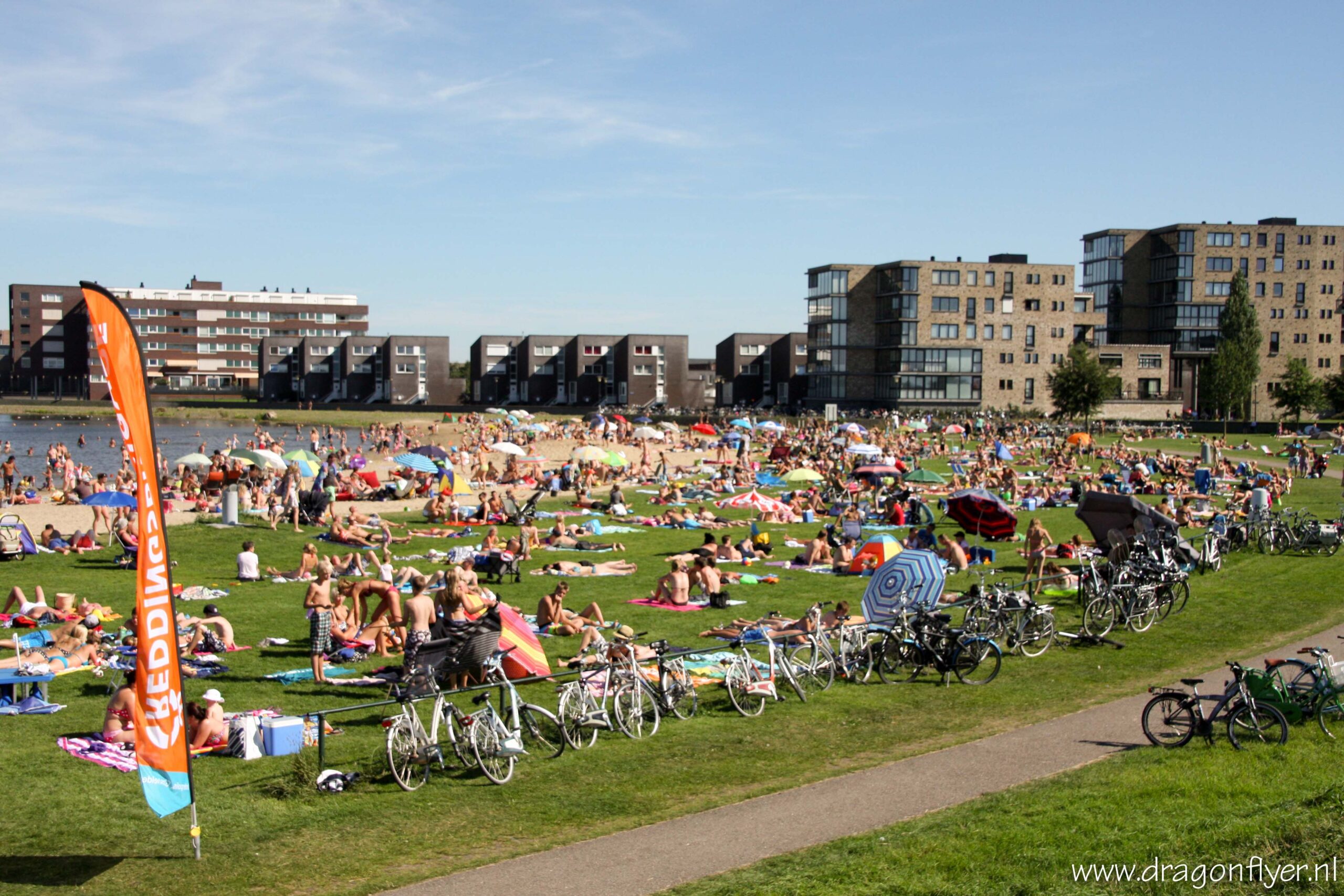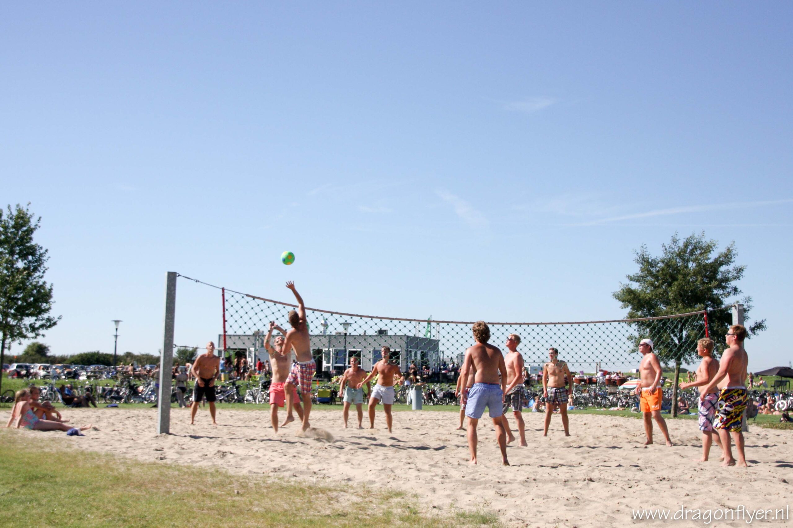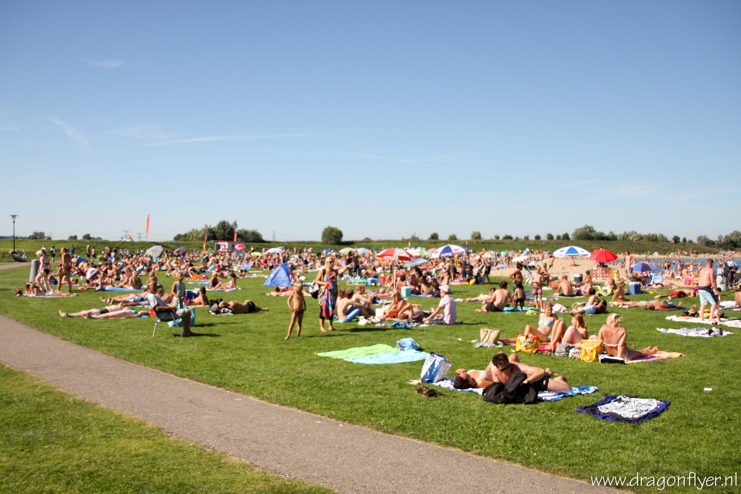 Warm, zeg maar gerust heet. Zaterdag 18 augustus is genoteerd als de eerste tropische dag van het 2012. In De Bilt passerde het kwik rond kwart voor drie de 30 graden Celsius. Ook hier in ons Stadshagen vielen de mussen hier en daar letterlijk van het dak.Vele mensen zochten verkoeling bij de Milligerplas. Het strand zat dan ook overvol met zonaanbidders en spelende kinderen. Voor sommigen was het nog niet warm genoeg, zij hadden nog energie over voor een fanatiek potje volleybal, en dit allemaal onder de brandende zon.